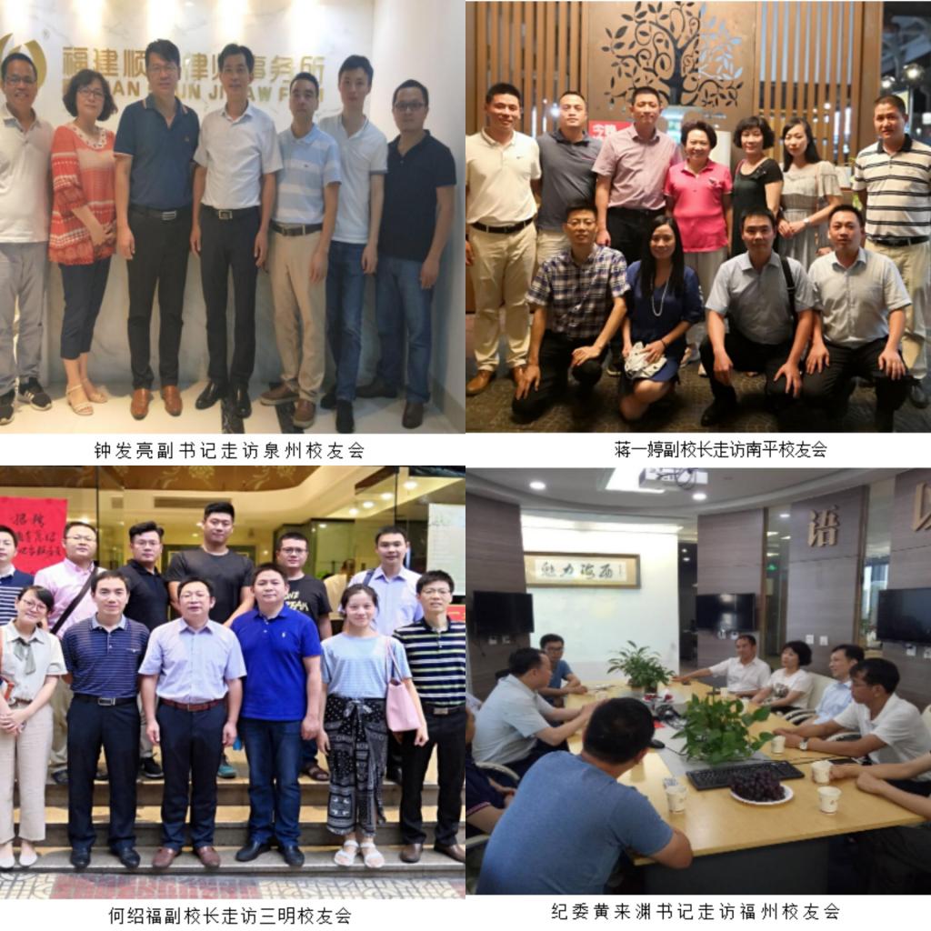 8月下旬,校黨委書記吳彬鏹走訪寧德校友會,與來自政府部門、群團組織、高校院所、中學、律師事務所等領域的10余位校友代表座談交流。寧德校友紛紛表示,要進一步充實發展校友會力量,積極舉辦高水平校友活動迎接母校60周年校慶。副校長蔣一婷帶領相關部門走訪南平校友會,深入了解南平校友會的發展建設,鼓勵校友會充分發掘校友資源為南平校友的發展貢獻力量。吳彬鏹、蔣一婷等校領導還專程前往莆田走訪看望莆田校友,與新一屆莆田校友會成員親切交流,共商學校60周年校慶和莆田校友會的發展工作。校黨委副書記鐘發亮走訪考察福建西窗影視有限公司、福建順濟律師事務所等校友企業,并與泉州校友親切座談。
