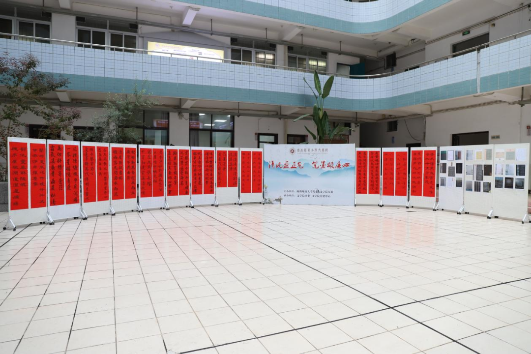 日前,校紀(jì)委聯(lián)合文學(xué)院黨委圍繞廉潔文化建設(shè)主題,開(kāi)展“清風(fēng)盈正氣,筆墨頌廉心”主題楹聯(lián)創(chuàng)作大賽和硬筆書(shū)法大賽活動(dòng),獲獎(jiǎng)作品在博文樓東區(qū)展出。校黨委常委、紀(jì)委書(shū)記戴福康帶隊(duì)到場(chǎng)指導(dǎo)。