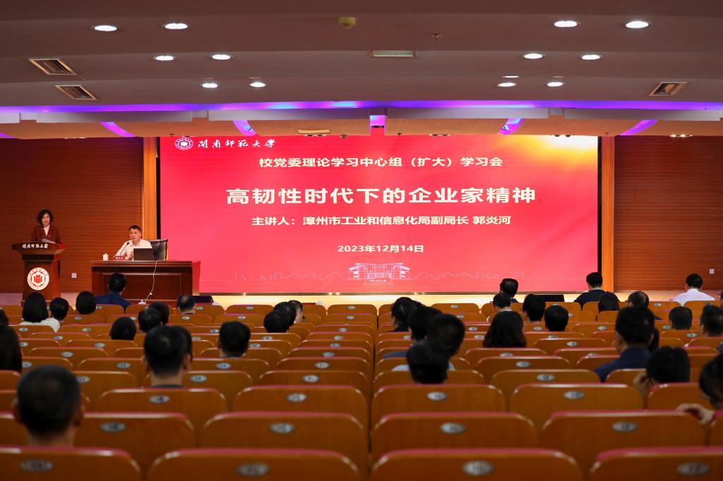 12月14日下午,校黨委在逸夫圖書館五樓報告廳召開理論學習中心組(擴大)學習會,邀請漳州市工業和信息化局副局長郭炎河作題為《高韌性時代下的企業家精神》的專題報告。全體在家校領導,全校中層干部,數學與統計學院、物理與信息工程學院、化學化工與環境學院、計算機學院、生物科學與技術學院、商學院博士教師代表,各創新平臺負責人,學科建設與研究生工作處、教務處、科研處、社會合作處科級干部等200余人參加學習會。學習會由校黨委宣傳部、統戰部部長徐繼紅主持。