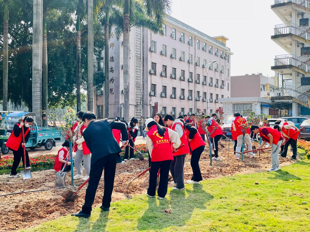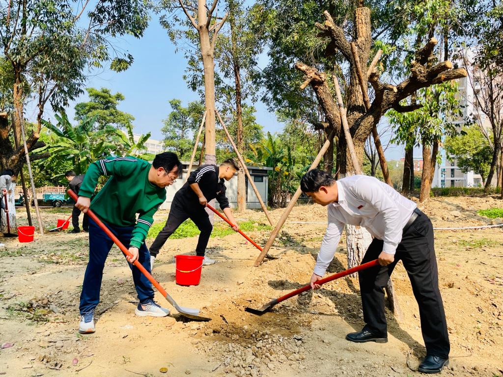 校領導和師生們來到江濱校區東區6號樓前綠化帶、中區口袋公園東南側樹林,在技術人員的指導下,挖坑放苗、扶苗培土、拎桶澆水,共栽植了雞冠刺桐15棵,海棠花苗1.8萬株。