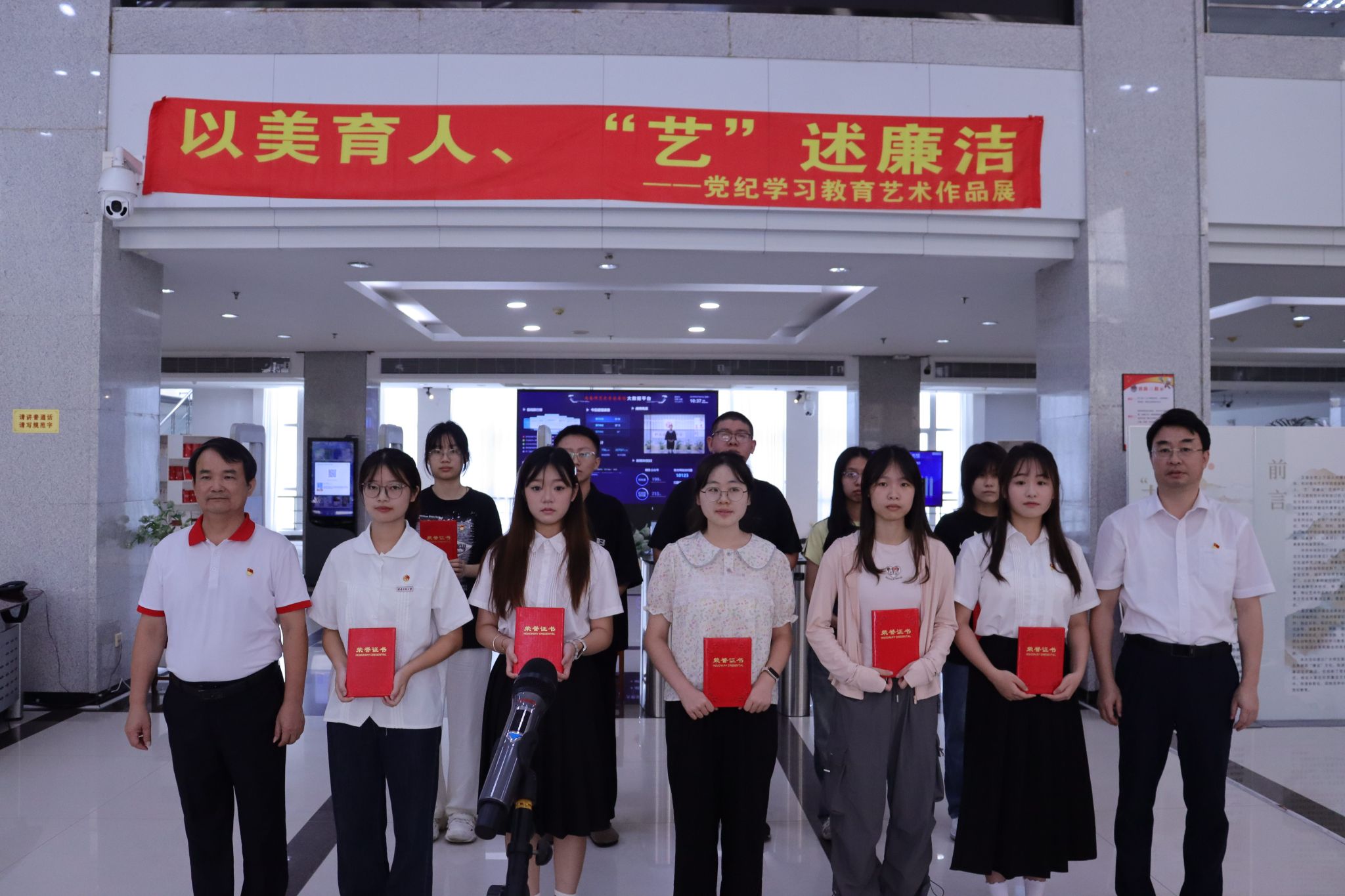 為深入學習領會習近平總書記關于全面加強黨的紀律建設的重要論述,深化開展黨紀學習教育,扎實推動學校“五廉育人”和“一院一品”校園廉潔文化建設,7月1日上午,由校紀委和藝術學院聯合主辦的“以美育人、藝‘述’廉潔”藝術作品展在逸夫圖書館二樓開幕。校黨委常委、副校長張龍海,校黨委常委、紀委書記戴福康出席,學校相關職能部門負責人、藝術學院黨政班子成員和師生代表參加活動。