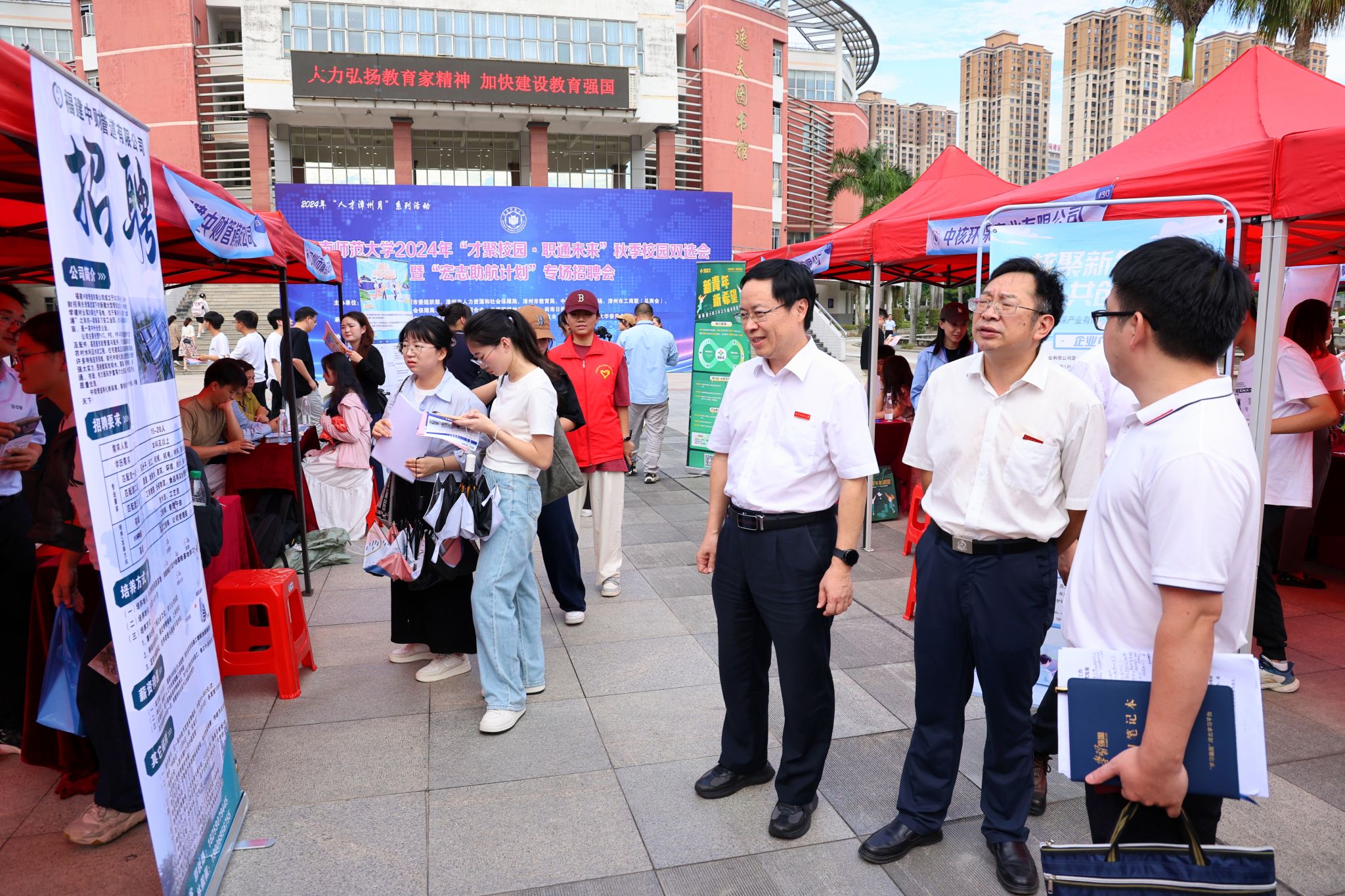 校領(lǐng)導(dǎo)林致遠、何紹福走進招聘會現(xiàn)場調(diào)研指導(dǎo),深入福州市人社局、廈門市思明區(qū)人社局、南平市邵武市教育局、昌吉回族自治州實驗小學(xué)、中核環(huán)保產(chǎn)業(yè)有限公司、華峰華錦有限公司等多個招聘攤位,與用人單位進行交談,了解企業(yè)發(fā)展情況、用人需求,認真聽取用人單位在招聘流程、薪資待遇、職涯發(fā)展、福利保障等方面的介紹,并向用人單位推介我校畢業(yè)生。