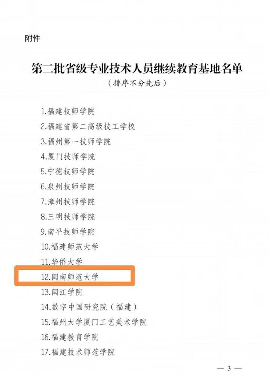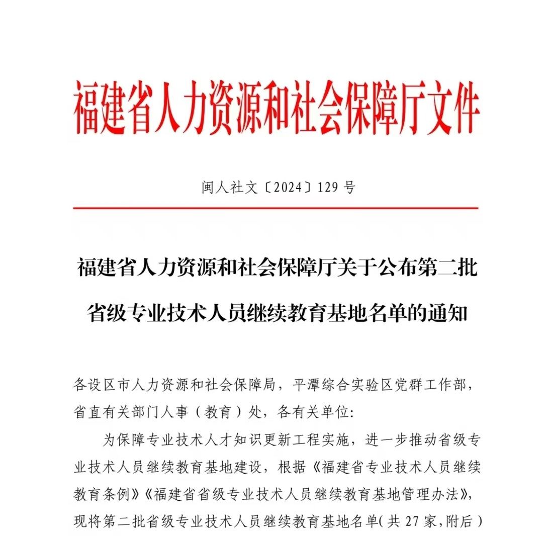 近日,福建省人力資源和社會保障廳公布第二批省級專業技術人員繼續教育基地名單,我校成功入選。此次認定工作由省人社廳組織,經推薦申報、復核、實地考察、綜合評議等環節,共遴選出27家單位。