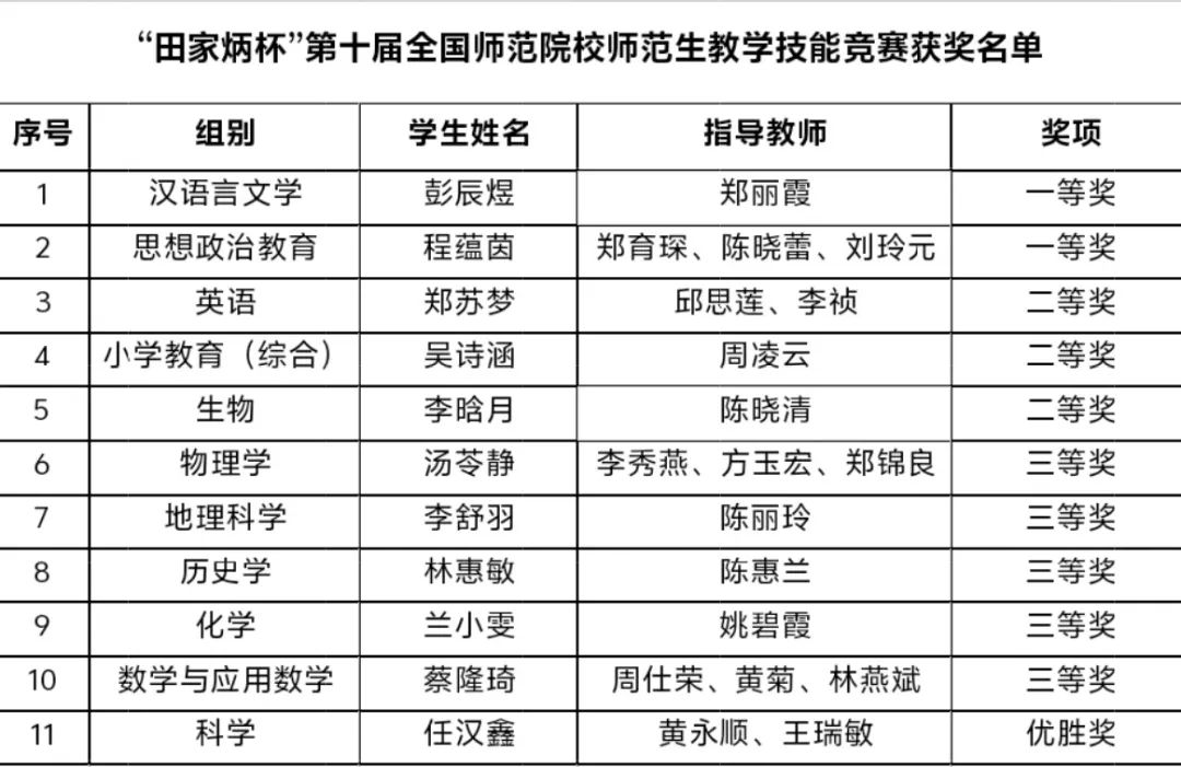 12月1日,第十屆“田家炳杯”全國(guó)師范院校師范生教學(xué)技能競(jìng)賽決賽在浙江師范大學(xué)落幕。我校共有11名學(xué)生參加比賽,獲得一等獎(jiǎng)2項(xiàng),二等獎(jiǎng)3項(xiàng),三等獎(jiǎng)5項(xiàng),優(yōu)勝獎(jiǎng)1項(xiàng),創(chuàng)下我校本項(xiàng)賽事參賽歷史最好成績(jī)。