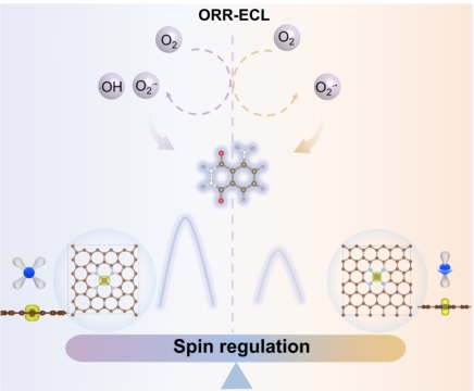 該研究通過改變N源制備了兩種CoN4單原子催化劑,通過研究它們在魯米諾/溶解氧體系中陰極掃描時的電化學(xué)發(fā)光(ECL)行為,發(fā)現(xiàn)CoN4(吡啶N)的自旋密度表現(xiàn)為dz2軌道特征,而CoN4(吡咯N)的自旋密度表現(xiàn)為dxz軌道特征,這更有利于將O2?-中的O-O鍵裂解為?OH,從而產(chǎn)生更活躍的中間體*OH,促進(jìn)陰極ECL發(fā)射。該研究表明,ECL技術(shù)為快速識別CoN4 SACs中Co-N配位類型和金屬中心的自旋性質(zhì)提供了一種新方法。