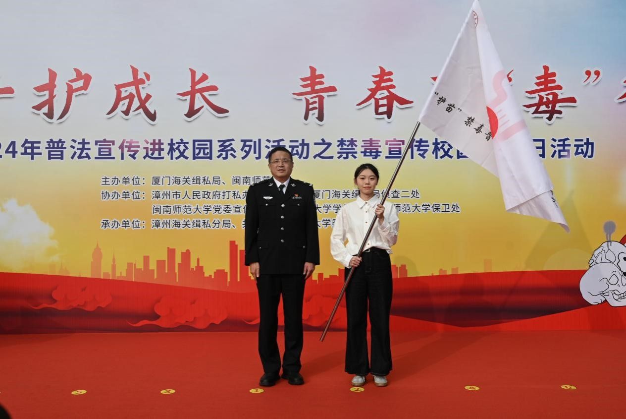 隨后,廈門海關緝私局黨組成員、副局長陳文亮為閩南師大“護苗”禁毒普法宣講志愿服務隊授旗,號召閩南師大青年志愿者們肩負起禁毒宣傳和服務的重要使命。