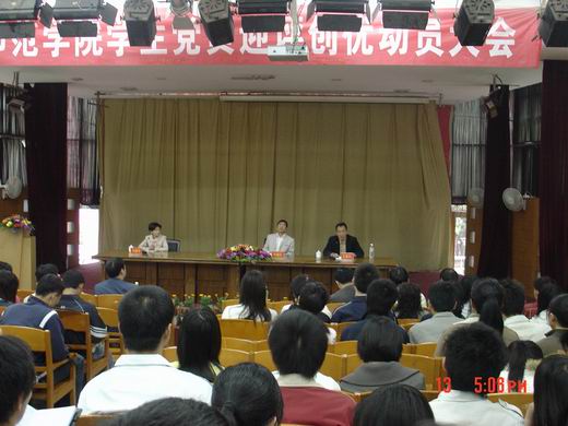 大梯教花團錦簇,《團結就是力量》在會場上激蕩,氣氛熱烈而緊張,近八百名學生黨員代表和全體學生政工干部參加動員大會。動員大會分兩場舉行,由學生處處長林靜華主持。院長王復興和院黨委副書記林春生在會上分別作了振奮人心的動員講話。