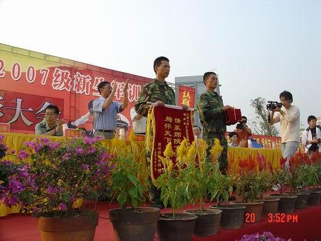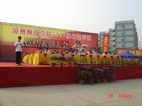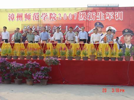 10月20日下午,晴空萬里,2007級新生軍訓總結表彰大會在瑞京籃球場隆重舉行。院黨委副書記林春生、副院長肖慶偉、漳州市軍分區后備辦主任李新長、司令部參謀陳宙峰、院各部處領導以及各系黨政負責人出席了會議。院學生處處長林靜華主持大會。