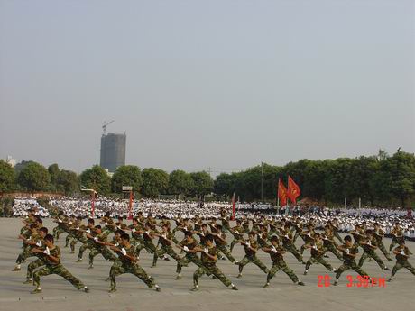 雄壯的國歌聲過后,從八十五個參訓班級中脫穎而出的化學系環境科學2班和體育系體育教育1班代表18個優勝班級進行了精彩的隊列表演。緊接著,由64名男同學組成的方隊表演了格斗操,他們身著迷彩服,英姿颯爽,動作整齊劃一,充分展示了師院男兒的沖天豪氣,贏得了在場觀眾一片喝彩;64名教官的軍體拳表演更是威武有力,氣吞云霄,讓全場師生再次領略了英勇善戰的當代軍人風采。