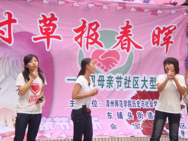 5月13日是一個特別的日子——母親節,在這個神圣的節日里,歷史與社會學系06級社會工作專業的學生,給金寶花園社區的母親們獻上了一份特別的禮物——“寸草報春暉”感恩母親節大型晚會。歷史與社會學系老師、金寶花園居委會及東鋪頭街道辦事處的相關領導親臨現場觀看指導。