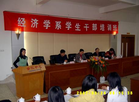 學生干部是高校學生中的優秀群體,是青年學生學習、生活和工作中的榜樣。為加強學生干部的自我服務、自我教育、自我管理能力,建設一支素質高、作風硬、實力強的學生干部隊伍,經濟學系首屆學生干部培訓班于2007年3月24日隆重開班。經濟學系主任侯曙光、系黨總支副書記李定慶、系副主任黃春松、系團委副書記邱文芳、院團委副書記王建紅以及本系輔導員出席了開班式。