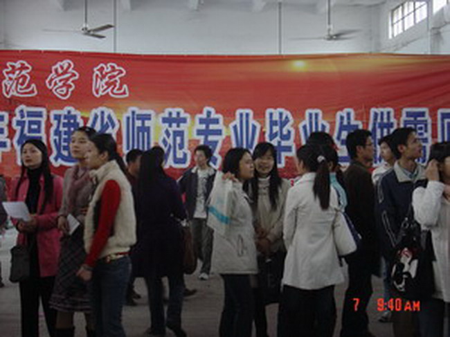 4月7日,2007年福建省師范類畢業生供需見面會在我院體育訓練館隆重召開。本次招聘會吸引了上千名師范類畢業生前來參加,據悉,有四十多家省內教育單位前來招聘,如漳州立人學校、南安國光中學、泉州市現代中學等。從早八時起直至中午,見面會現場始終人頭攢動。