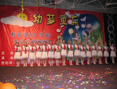 2007年4月7日晚,由教育系團委、學生會主辦,教育系05學前教育承辦的 “教育系05學前教育專業匯報演出”在學生活動中心舉行,教育系黨總支洪麗瑄副書記、教育系全體輔導員以及學前專業教研組的老師們一起出席了晚會現場。紙樹銀花的絢目禮炮聲中,匯演晚會隆重開幕。