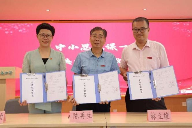陳再生代表學院與結對共建學校簽署共建協議。簽約儀式結束后,還啟動漳州市大中小學師生“感悟思想偉力 凝聚奮進力量——學習貫徹習近平新時代中國特色社會主義思想主題教育”網絡知識競賽。馬克思主義學院青年教師陳曉蕾與龍文附小學生交流互動,她結合中國女排事跡和漳州籍國家體操隊隊員邱祺緣的事跡,鼓勵同學們努力拼搏,樹立繼續向更大的舞臺挑戰的決心和信心。