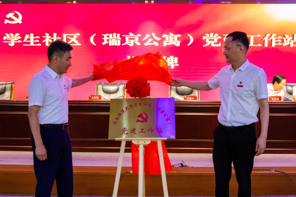 閩南師范大學(xué)校黨委書記吳彬鏹,校黨委副書記、校長李順興為“學(xué)生社區(qū)(瑞京公寓)黨建工作站”揭牌
