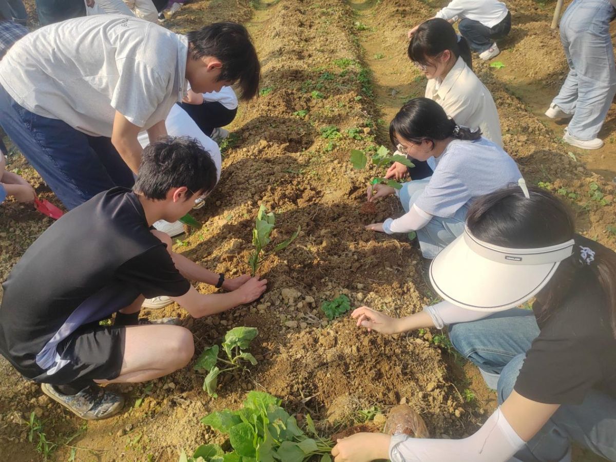 同學們分組領取菜苗后,在老師指導下依次完成挖穴、扶苗、培土、澆水等工序。舒展著生命律動的稚嫩菜苗間,萌發著年輕學子對自然的探索熱情。“蔬香門地隊”的小王同學捧著剛栽下的幼苗感嘆:“這可是我第一次種菜!看著它挺立在田壟上,突然懂了‘春種一粒粟’的深意。”這不僅是蔬菜的播種,更是丈量生命成長規律的具象課堂,是勞動創造價值的具體實踐。