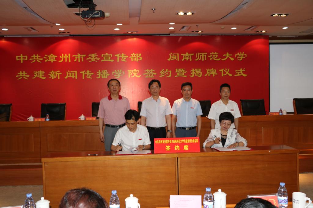 校黨委副書記鐘發(fā)亮、漳州市委宣傳部副部長陳惠貞代表雙方簽訂共建新聞傳播學(xué)院協(xié)議