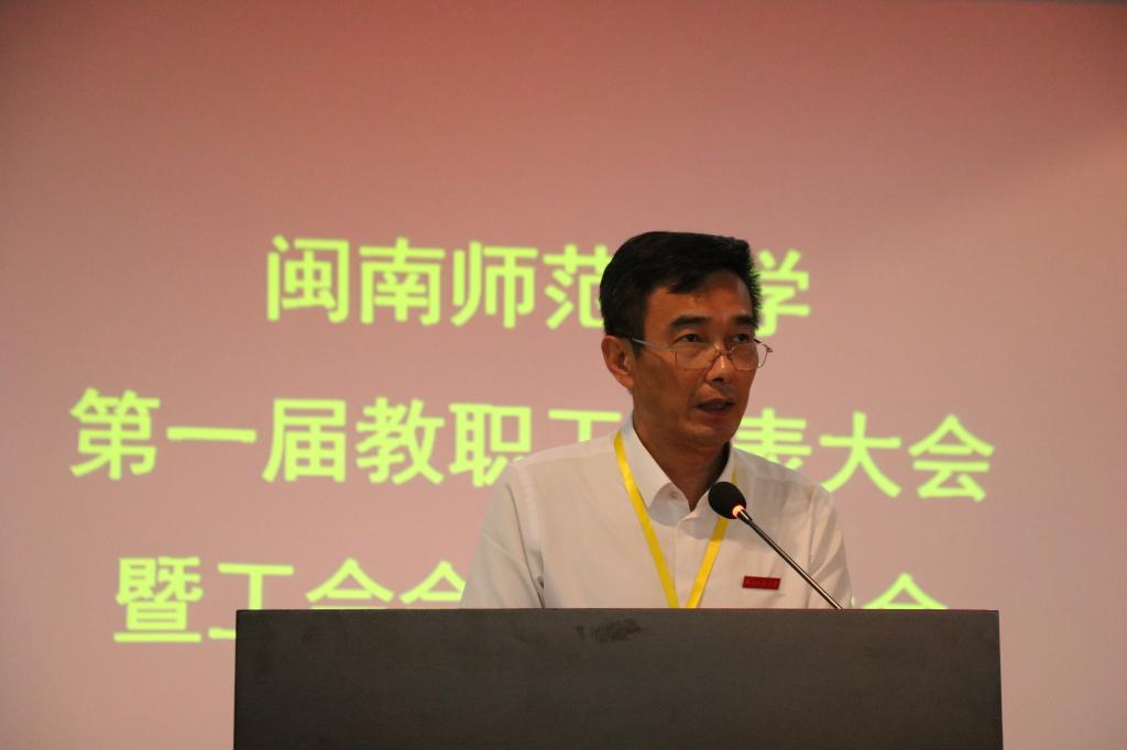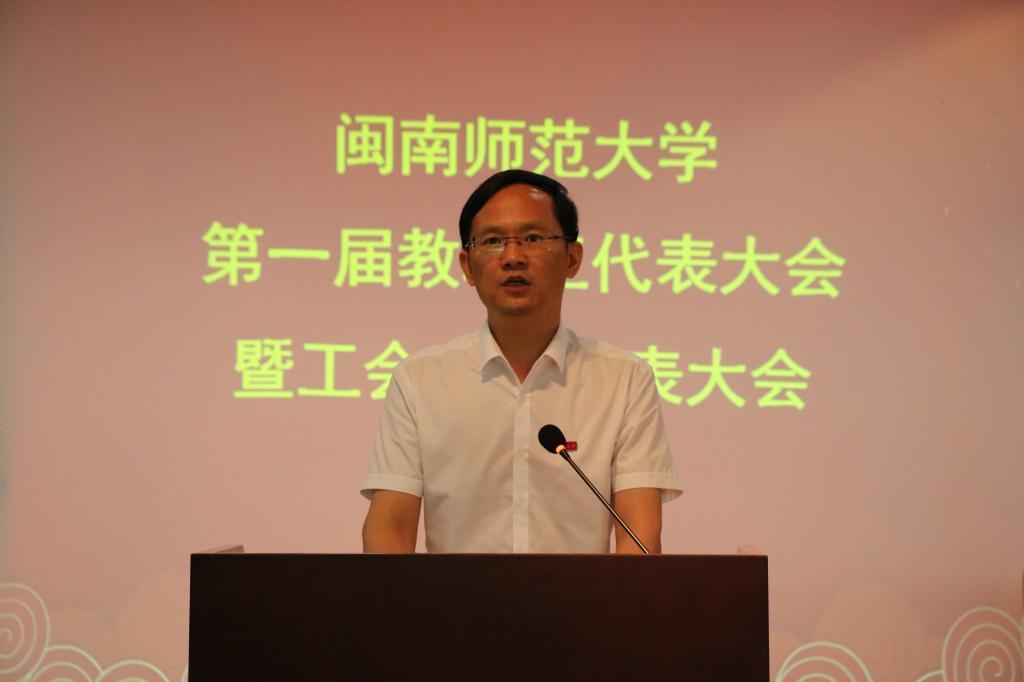 校黨委書記吳彬鏹在會上講話。吳彬鏹表示,會議期間,代表們以高度的政治責任感、歷史使命感和主人翁精神,認真履行職責、積極建言獻策,進一步統一了思想,形成了共識,增強了合力,充分展示了胸懷全局、心系發展的責任擔當及奮發向上、團結進取的精神面貌。他強調,全校師生要堅持以新閩師建設目標引領新發展、堅持以深化綜合改革推動新發展、堅持以奮力沖刺博士學位授權單位贏得新發展、堅持以新時代實干擔當的優良作風保障新發展。要在習近平新時代中國特色社會主義思想指引下,振奮精神,堅定信心,搶抓機遇,攻堅克難,全面加快改革發展步伐,同心協力建設“新閩師”。他希望新一屆教代會執委會和工會委員會牢固樹立“四個意識”,增強“四個自信”,牢牢把握教代會、工會工作正確的政治方向,充分發揮橋梁紐帶和促進民主管理的作用,圍繞中心、服務大局,加強自身建設,認真履職盡責,提高服務水平,努力建設教職工滿意信賴的“職工之家”;希望各位代表充分發揮代表性和先進性,廣泛深入聯系師生群眾,率先垂范做好本職工作,團結和動員廣大教職員工振奮精神、開拓創新、擔當作為,同心協力為學校改革發展做出新貢獻。