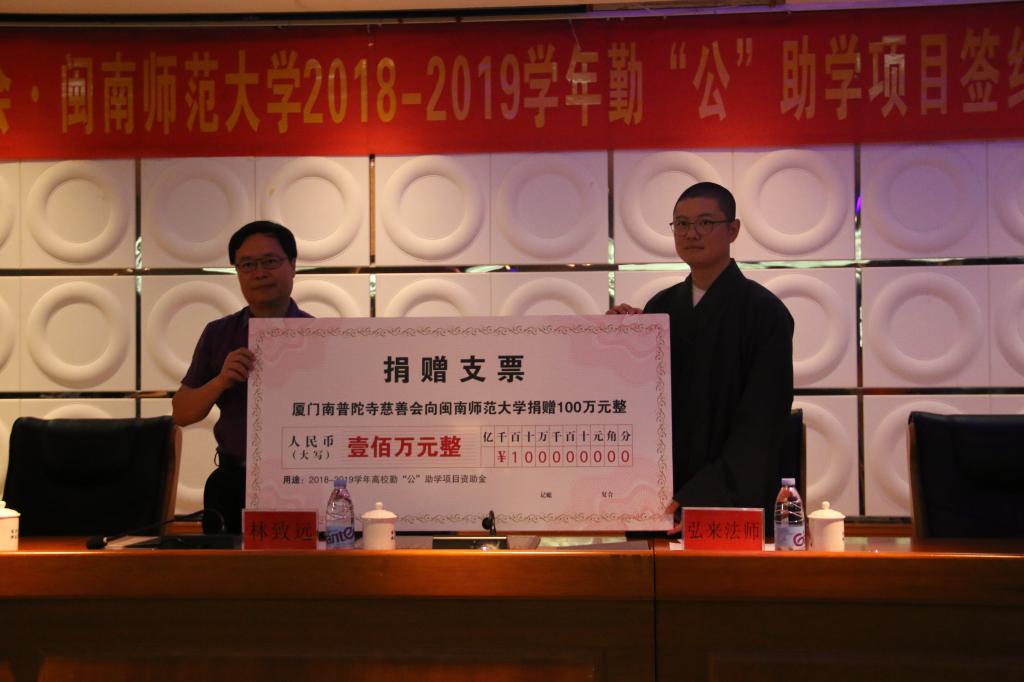 日前,廈門南普陀寺慈善會(huì)?閩南師范大學(xué)2018—2019學(xué)年勤“公”助學(xué)項(xiàng)目簽約儀式在我校逸夫圖書館五樓報(bào)告廳舉行。校黨委常委、副校長(zhǎng)林致遠(yuǎn),南普陀寺慈善會(huì)副會(huì)長(zhǎng)弘來法師、南普陀寺慈善會(huì)能順法師、原廈門醫(yī)學(xué)高等專科學(xué)校黨委書記王巧萍等出席簽約儀式,各學(xué)院輔導(dǎo)員代表、全體受助學(xué)生參加活動(dòng)。簽約儀式由校學(xué)工部副部長(zhǎng)李苗主持。