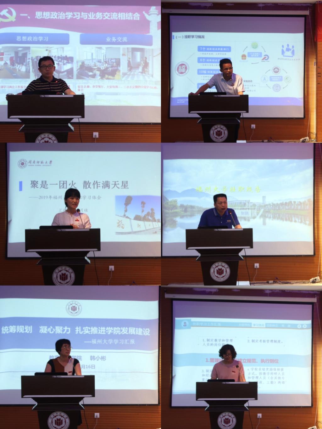 報告會結束后,我校赴福州大學掛職的6名干部做了學習匯報。臨時黨支部支部書記胡海智匯報了掛職期間臨時黨支部開展理論學習的情況,6名掛職干部分別匯報了各自在掛職兩個月期間的學習收獲和體會,和與會人員分享了福州大學在教學、科研、管理、服務及創新創業等方面的先進經驗,提出了學習借鑒兄弟高校優秀做法的思考和建議。