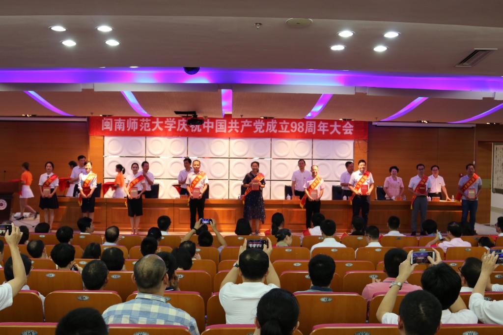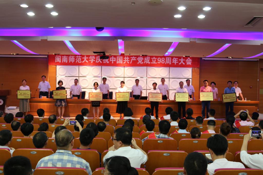 校黨委副書記鐘發亮在會上宣讀了校黨委表彰決定。吳學兵等65人被評為校優秀共產黨員,黃艷紅等19人被評為優秀黨務工作者,文學院黨委等17個黨組織被評為先進基層黨組織。林輝、林楓分別被評為漳州市優秀共產黨員、優秀黨務工作者,數學與統計學院黨委被評為漳州市先進基層黨組織。校黨委常委為獲獎的先進基層黨組織和先進個人頒獎,并為首批“雙帶頭人”教師黨支部書記工作室培育創建單位授牌。