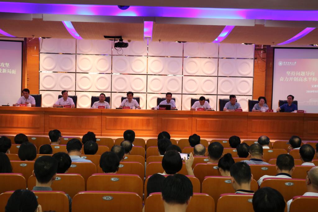 校黨委書記吳彬鏹作題為《堅持問題導向 持續發力攻堅——奮力開創高水平師范大學建設新局面》的講話。吳彬鏹指出,新學期學校要扎實開展“不忘初心、牢記使命”主題教育,進一步在全校上下推動形成人人講擔當、事事認真干的濃厚氛圍,把認真工作和責任擔當內化于心,外化于行;要持續推進全面從嚴治黨再深化再落實,積極加強思想政治教育,認真落實安全工作責任制,加強意識形態陣地管理,全力確保校園安定穩定。各單位要科學謀劃工作,努力做到志存高遠、行穩致遠;要聚焦解決問題,努力做到認真履責、敢于負責;要全面深化改革,努力做到激發活力、增強動力,確保2019年各項工作任務落地落實落到位。