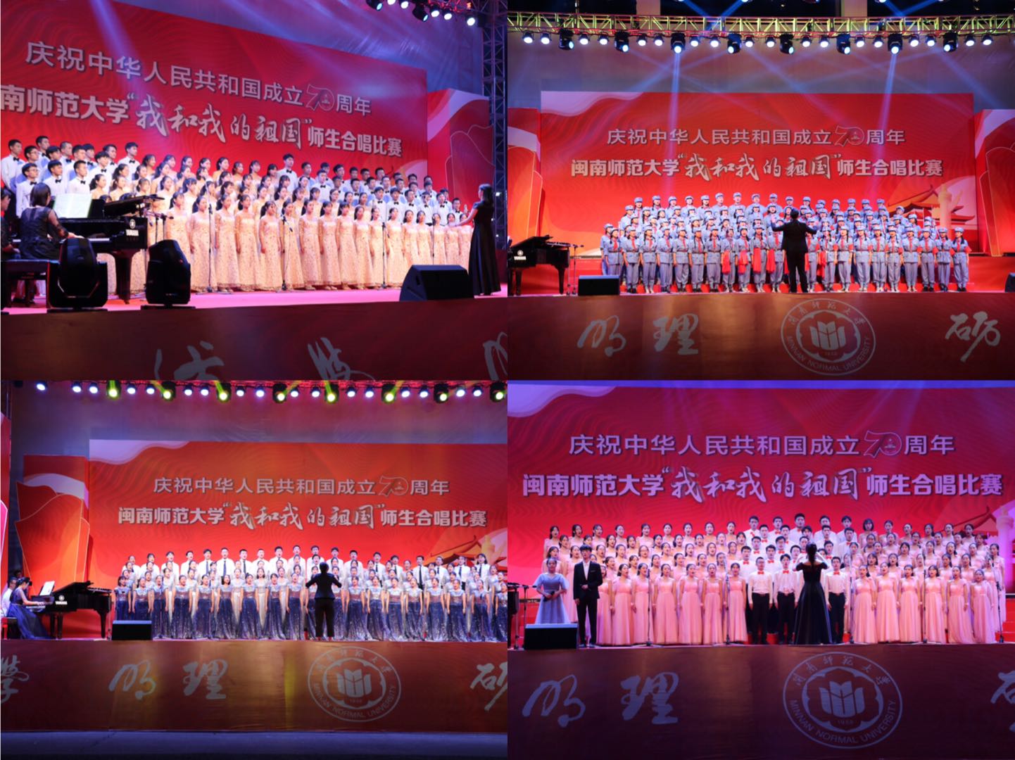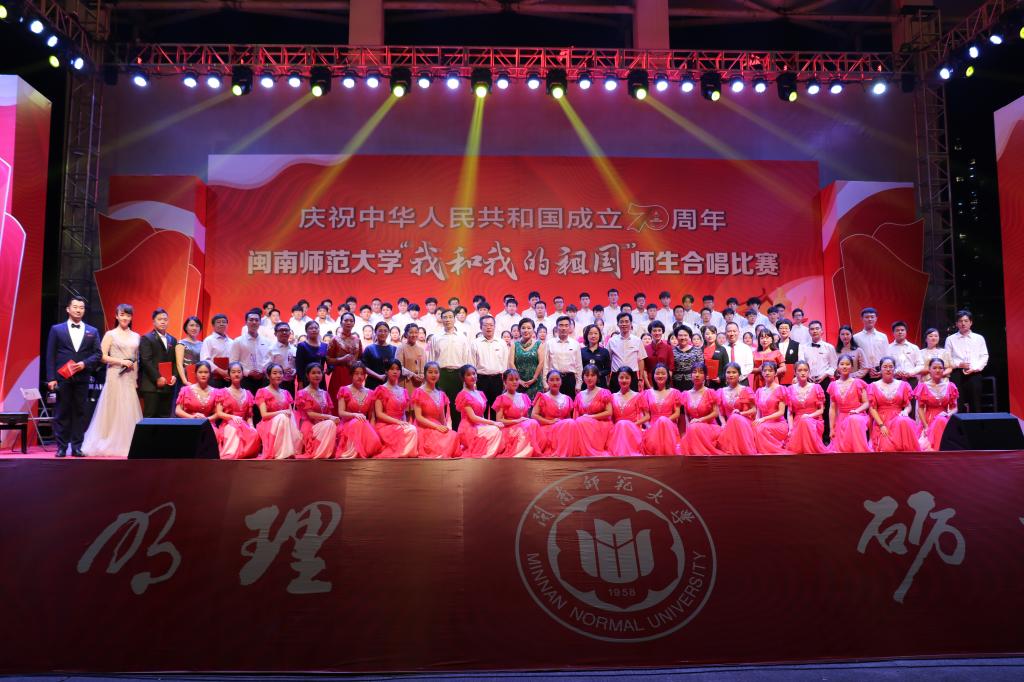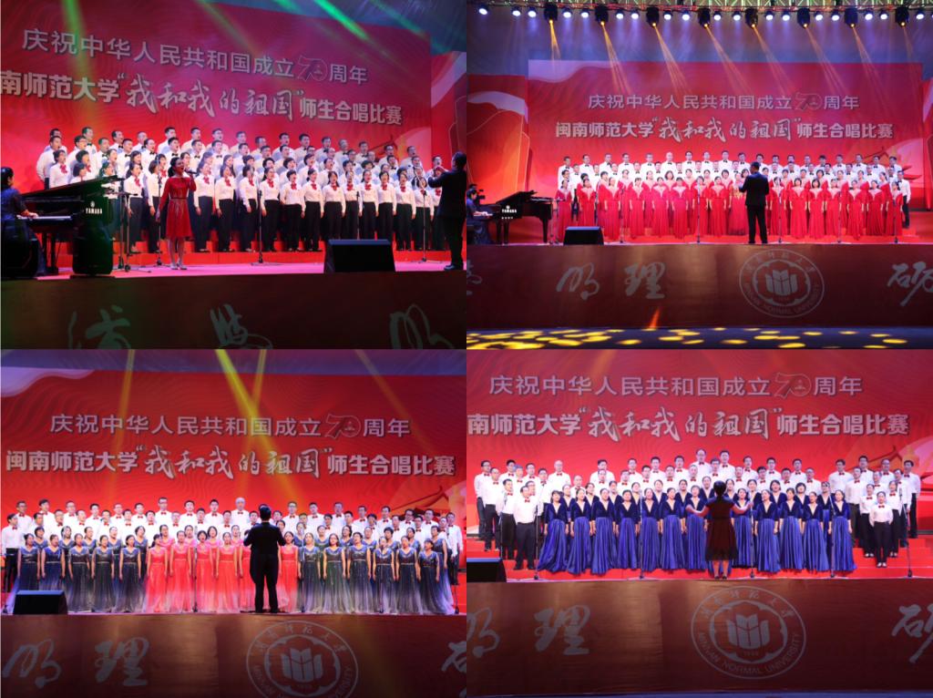 體育學院學生代表隊在合唱中加入武術表演和舞蹈;新聞傳播學院學生代表隊用澳門回歸和寄家書的小表演,完成《我和我的祖國》與《七子之歌》的無縫銜接;生物科學與技術學院、物理與信息工程學院、教育科學學院教師代表隊在合唱中加入舞蹈、朗誦。藝術學院“閩之南”合唱團傾情演繹了《閩南師范大學校歌》《祖國頌》,為全場師生帶來美妙的音樂盛宴。