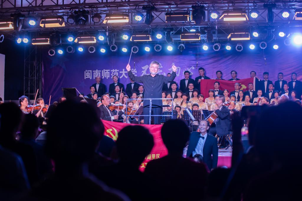 我校孫錦標老師作為指揮,帶領漳州市百花合唱團帶來了《龍的傳人》《我的祖國》等耳熟能詳的歌曲。音調忽而斗轉輕快,忽而輕緩綿長,唱響了新時代最強音。演出中,更有將管弦樂融入合唱的曲目《我愛你中國》《在燦爛的陽光下》,大小提琴、打擊樂、雙簧管等樂器在演奏家們的默契配合下顯得流暢愜意、渾然天成。音樂會最后,全場齊唱《歌唱祖國》,歌聲在龍文館內久久回蕩,為音樂會畫上圓滿的句號。