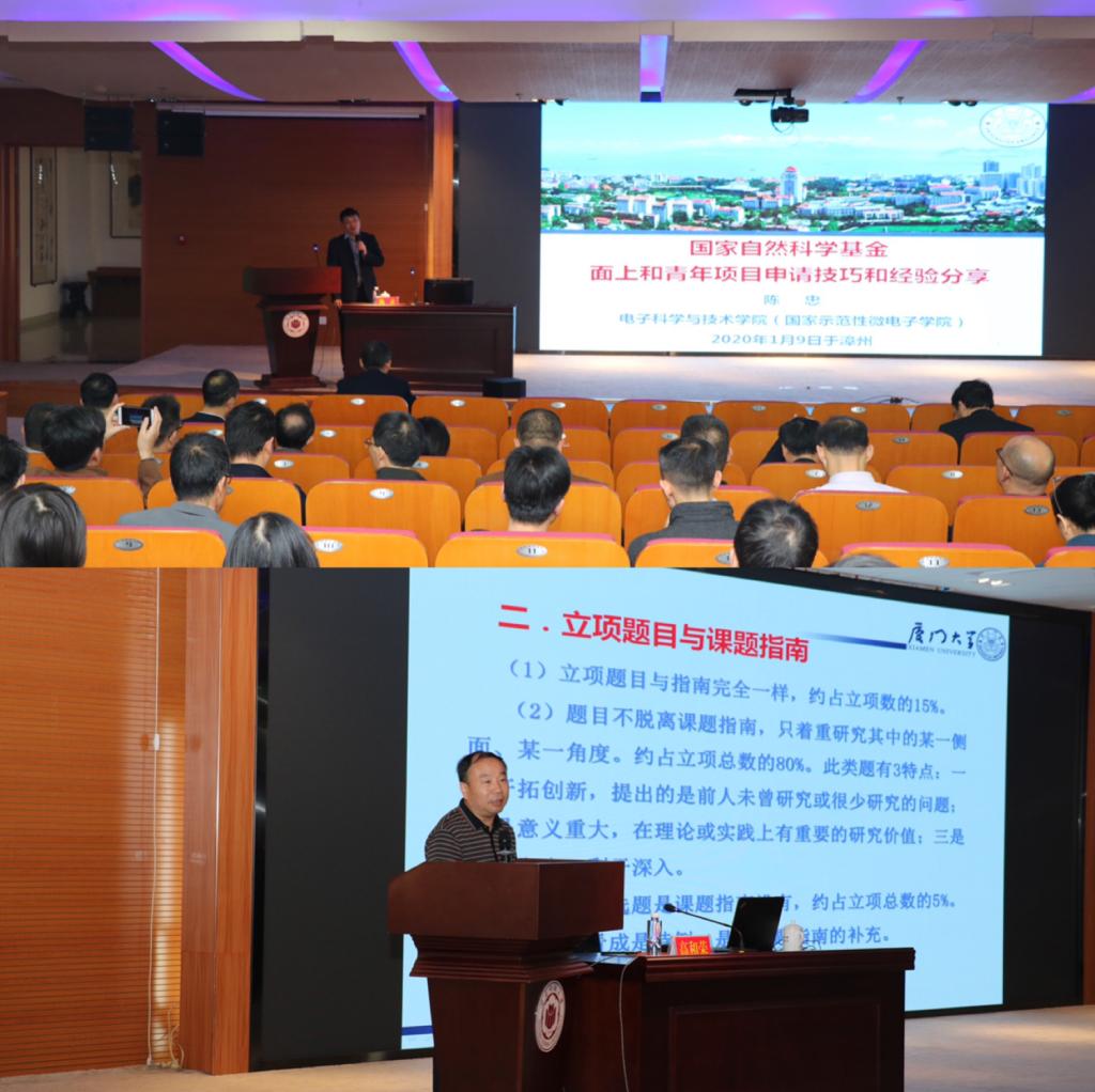 當(dāng)天還舉行國(guó)家級(jí)項(xiàng)目申報(bào)輔導(dǎo)報(bào)告會(huì)。會(huì)上,廈門(mén)大學(xué)電子科學(xué)與技術(shù)學(xué)院主持工作副院長(zhǎng)陳忠教授作了題為《國(guó)家自然科學(xué)基金面上和青年基金項(xiàng)目申報(bào)技巧與體會(huì)》的輔導(dǎo)報(bào)告,分享了國(guó)家自然科學(xué)基金申報(bào)的技巧和項(xiàng)目申報(bào)、項(xiàng)目管理的經(jīng)驗(yàn)。廈門(mén)大學(xué)社科處處長(zhǎng)高和榮教授作了題為《談?wù)剣?guó)家社科基金的申報(bào)》的輔導(dǎo)報(bào)告,解讀了2020年國(guó)家社科基金項(xiàng)目申報(bào)文件的變化,介紹了項(xiàng)目書(shū)撰寫(xiě)的規(guī)范和常見(jiàn)問(wèn)題。