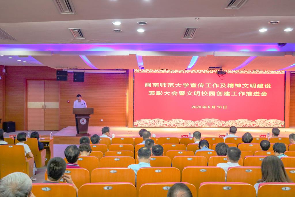 6月18日下午,我校在逸夫圖書館五樓報告廳召開2019年宣傳工作及2018-2020年精神文明建設表彰大會暨福建省第二屆文明校園創建工作推進會,表彰在宣傳工作、精神文明建設工作中涌現出的先進單位和個人,部署當前和今后一段時間學校精神文明建設的主要工作,對學校創建福建省第二屆文明校園進行再動員再部署。全體校領導、全校中層干部參加會議。會議由校黨委副書記肖慶偉主持。