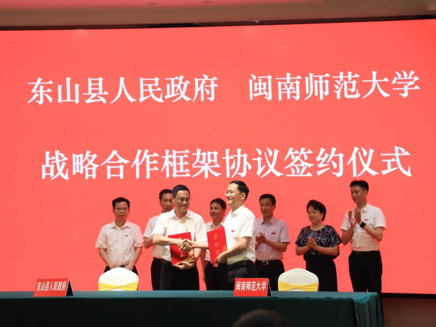 6月22日下午,我校與東山縣人民政府戰(zhàn)略合作框架協(xié)議簽訂儀式在東山縣谷文昌干部學(xué)院舉行。校黨委書記吳彬鏹,校黨委副書記、校長李順興,校黨委常委、副校長蔣一婷,東山縣委書記洪泰偉,縣委副書記、縣長黃鍵鵬,縣領(lǐng)導(dǎo)沈義勇、王朝玲、林裕輝等出席簽約儀式。我校相關(guān)職能部門及有關(guān)學(xué)院負(fù)責(zé)人,東山縣有關(guān)部門負(fù)責(zé)人參加儀式。簽約儀式由東山縣人民政府副縣長王朝玲主持。