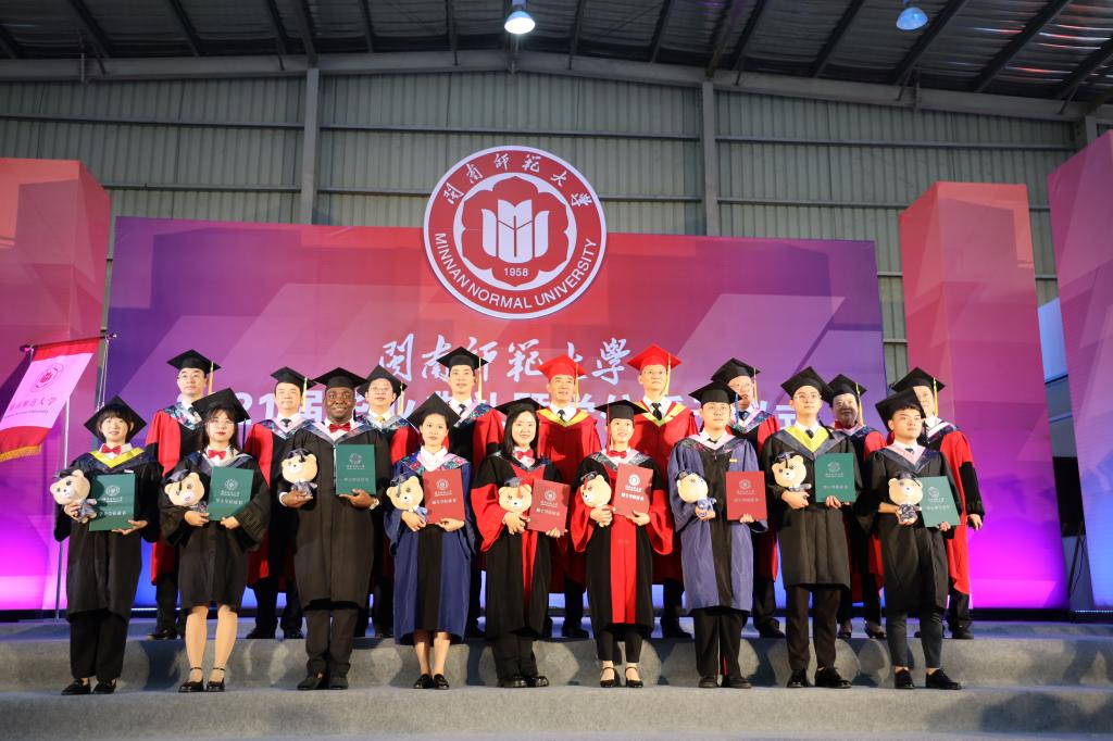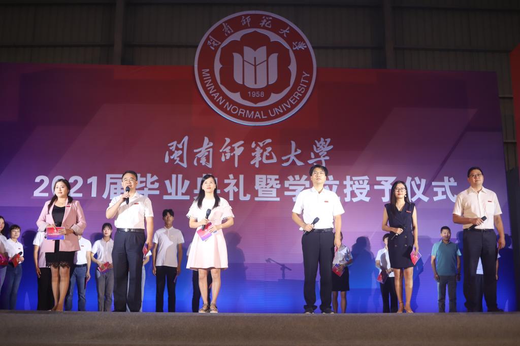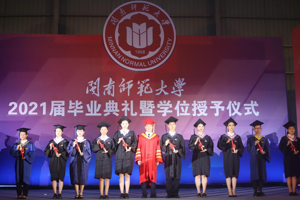 典禮開始前,原創(chuàng)畢業(yè)宣傳片《再見,閩南師大》首發(fā),視頻內(nèi)的一幕幕喚起屬于閩南師大人永不磨滅的記憶。上午8點,畢業(yè)生們莊嚴(yán)注視校旗、院旗入場,典禮在國歌聲中正式拉開帷幕。校黨委常委、副校長張龍海宣讀獲得博士學(xué)位、碩士學(xué)位、學(xué)士學(xué)位人員名單和2021屆優(yōu)秀畢業(yè)生表彰決定。今年,學(xué)校共有296名研究生獲得博士、碩士學(xué)位,4295名本科生獲得學(xué)士學(xué)位,將離開熟悉的校園,奔赴祖國的四面八方,走向更廣闊的天地,把青春華章寫在祖國的大地上。
