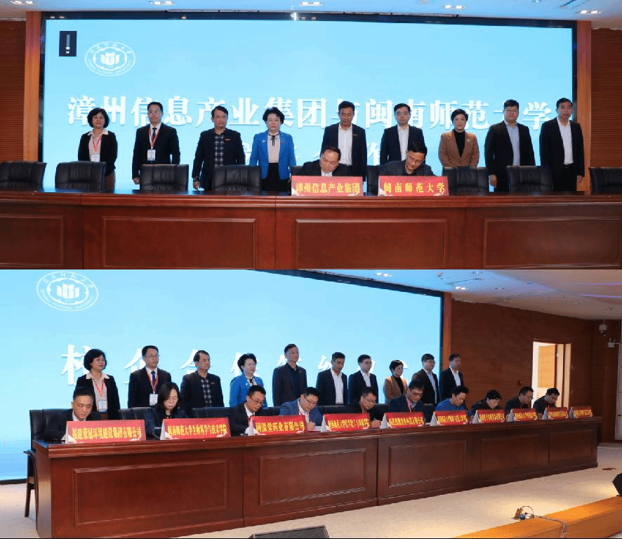 會上舉行了校企合作簽約儀式。校長李順興、漳州信息產業集團總經理吳學恒代表雙方簽訂《閩南師范大學漳州信息產業集團戰略合作協議》。根據協議,雙方將共同推進數字產業化、信息技術應用、數據服務和開發、智慧城市和智慧校園建設、電子商務、跨境電商、專業人才培養、信息產業資本運營、義務教育課后延時服務項目等方面的深度合作。此外,物理與信息工程學院、外國語學院、化學化工與環境學院、生物科學與技術學院分別與福建泓瀚光電科技有限公司、福建省卡爾頓食品有限公司、同溢堂藥業有限公司、漳州友商軟件有限公司、福建榮冠環境建設集團有限公司簽訂協議,項目簽約金額共計5362萬元。會后,與會人員分四組參觀了物理與信息工程學院、化學化工與環境學院、生物科學與技術學院及學校閩南文化辦學特色展。