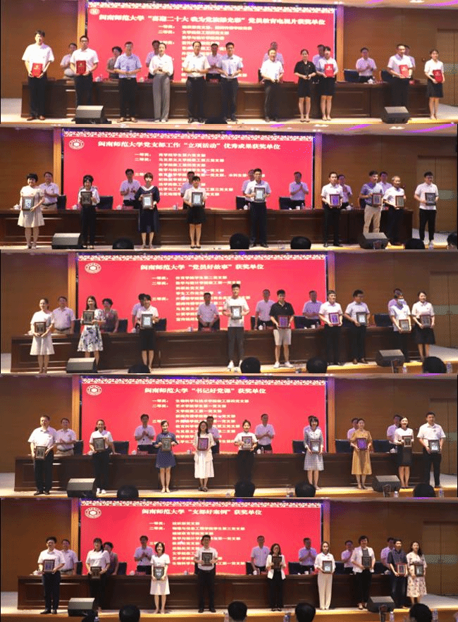 會上還進行基層黨建工作優秀成果表彰。校黨委副書記肖慶偉宣讀表彰對象名單。校領導為“喜迎二十大 我為黨旗添光彩”黨員教育電視片、2020-2022學年黨支部工作“立項活動”優秀成果和“黨員好故事、書記好黨課、支部好案例”獲獎單位頒發獎杯、獎牌和證書。