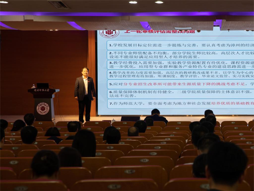 會上,張龍海對我校本科教育教學審核評估工作作動員部署。他回顧了我校參加上一輪審核評估的情況,介紹了新一輪審核評估在導向、內涵、類型等方面的新特點和學??傮w工作方案。他強調,各責任單位要認真學習領會審核評估指標體系內涵,加強工作落實,全面推進迎評各項任務,以充分的準備迎接專家組的考察。