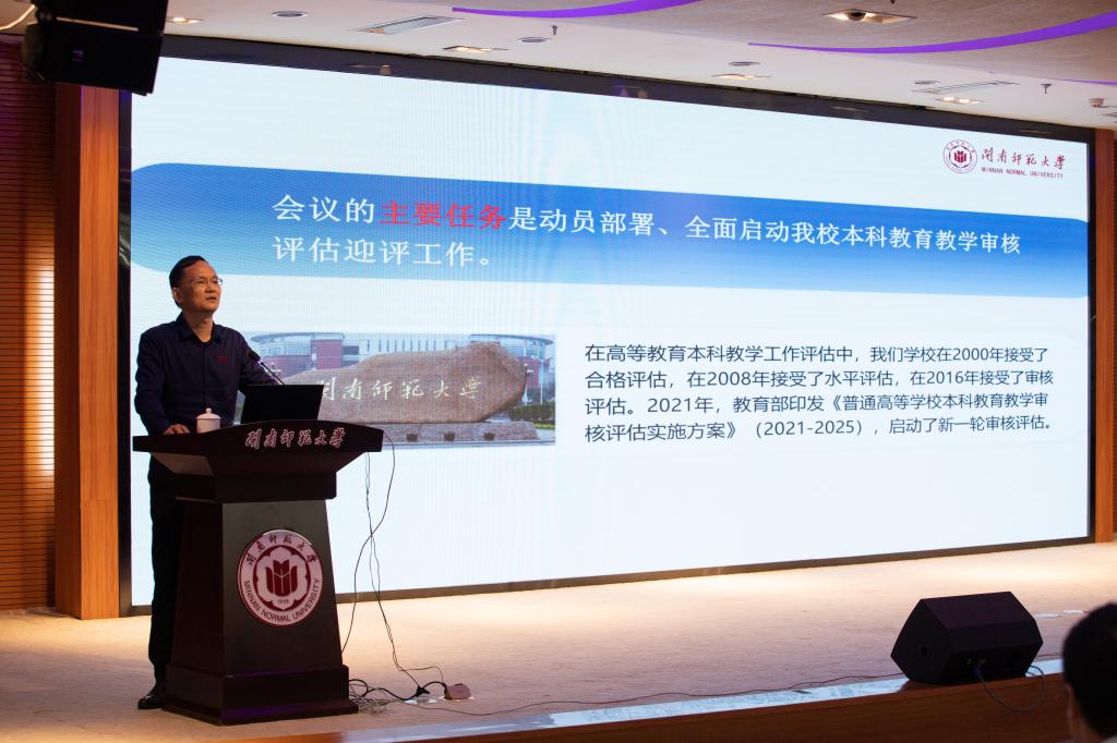 4月13日下午,我校在逸夫圖書館五樓報告廳召開本科教育教學審核評估工作動員部署會。校黨委書記吳彬鏹,黨委副書記、校長李順興,校領導林致遠、張龍海、戴??党鱿?,全校中層干部,各學院教學秘書、教務員,教務處全體人員參加。會議由教務處處長汪慶祥主持。