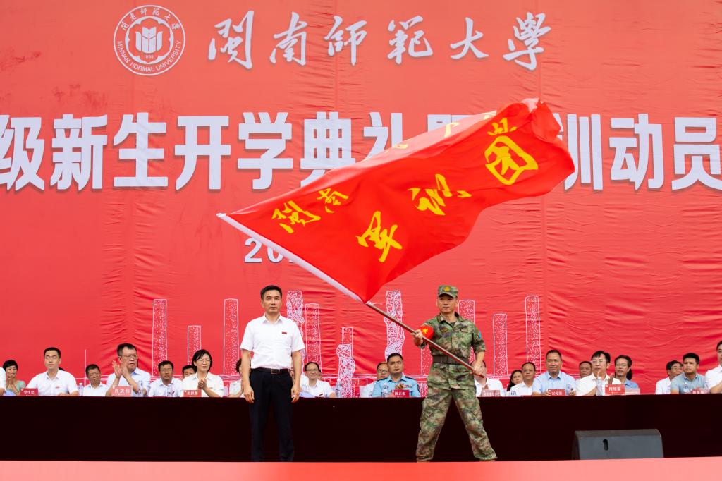 典禮上還舉行了校徽佩戴儀式,校領導為兩個校區的新生代表佩戴校徽,并為恰逢在開學期間過生日的新生送上禮包。吳彬鏹向閩南師范大學軍訓團、閩南師范大學圓山營教官代表授旗。現場各營、連旗幟同步揮舞,旌旗獵獵,與迷彩藍交相輝映。