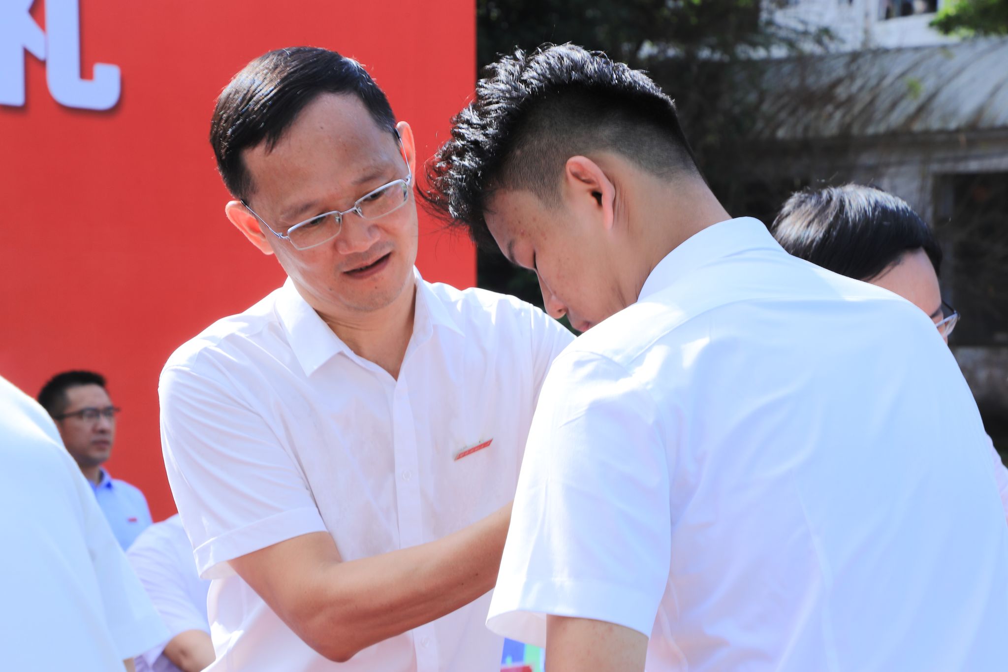 校領(lǐng)導(dǎo)為新生代表佩戴?;?/p>
