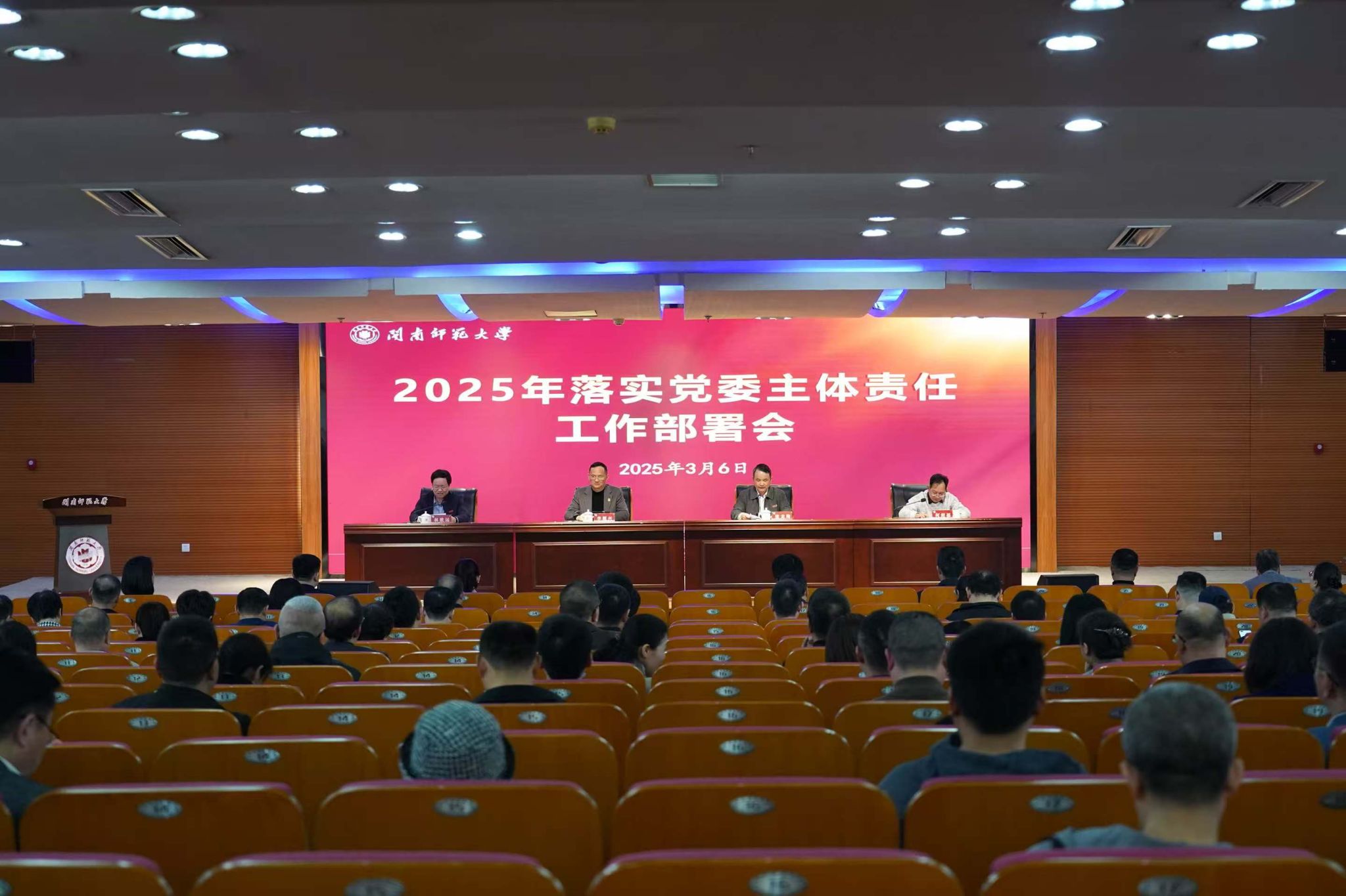 3月6日,我校在逸夫圖書館五樓報告廳召開2025年落實黨委主體責任工作部署會,全體在家校領導出席。會議由校黨委副書記、校長張龍海主持。